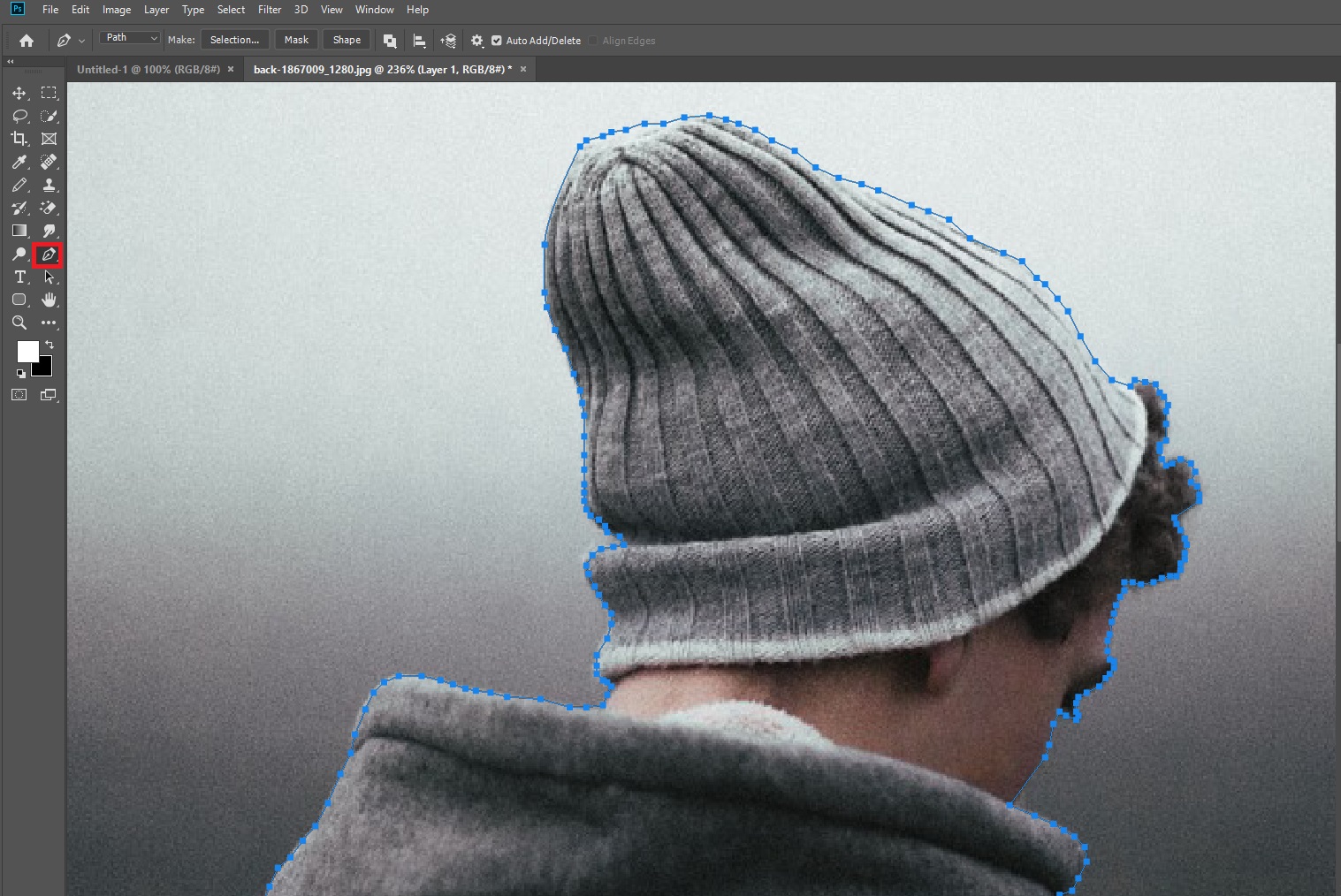 펜툴을 사용해 인물의 테두리를 이어가며 클릭해서 선택영역을 만들어 주겠습니다. 빠른선택툴과 선택영역이 지정되고나서 배경을 지우는 방법은 같지만, 선택영역을 지정하기 복잡하거나, 디테일하게 이미지의 선택영역을 만들어야 할때 사용하면 쉽게 사물과 배경을 분리 시킬 수 있습니다. 다만 펜툴을 많이 사용하지 않았다면 처음에는 어렵고 답답하게 느껴질 수 있지만, 많이 사용하다보면 빠르고 어렵지않게 사용할 수 있습니다. 보통 누끼딴다고 말하는 그작업을 펜툴로 하는경우가 많습니다.