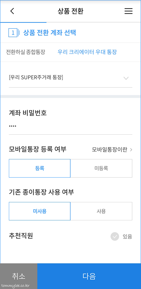 우리SUPER주거래통장→우리크리에이터우대통장 상품 전환하기.. 이거네요..