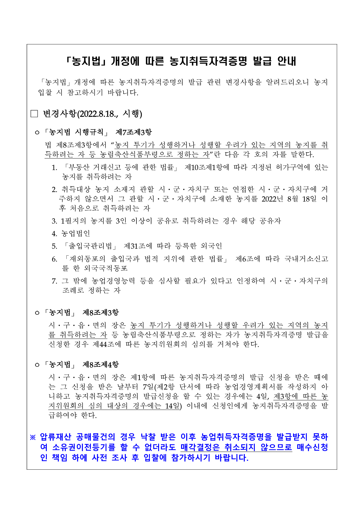 4. 2022년 5월 18일 농지취득 자격심사가 대폭 강화됨으로 증빙서류 추가 및 발급 민원처리 기간이 연장되었으므로 주의하시기 바랍니다