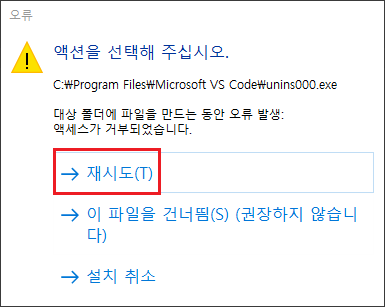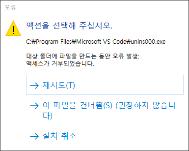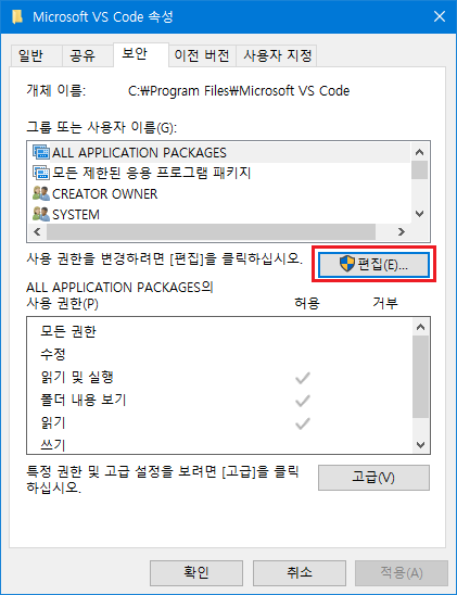 탐색기에서 설치 경로 (위 메시지에서는 C:\\Program Files\\Microsoft VS Code)를 우클릭해서 속성창을 연 뒤 '보안' 탭을 연 뒤 사용 권한 '편집' 버튼을 클릭