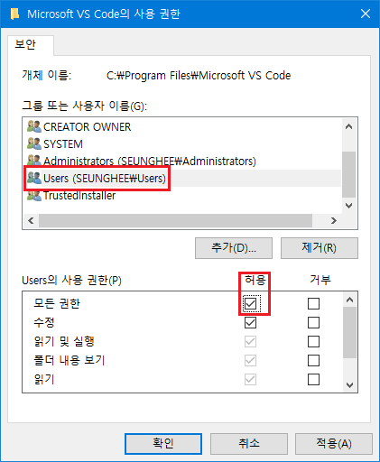 '그룹 또는 사용자 이름' 리스트에서 Users (로그인아이디\\Users) 선택 후 사용 권한 리스트에서 '모든 권한' 허용 체크박스 클릭 후 적용