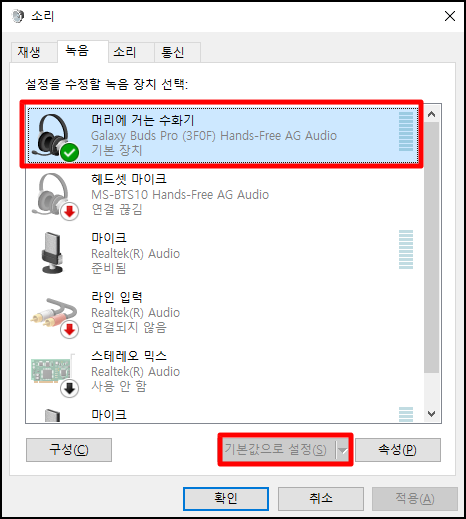※ 만약 체크가 안되어있으면 하단의 '기본값으로 설정'을 누르면 마이크 기본 설정이 된다.