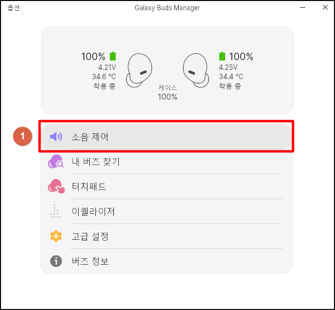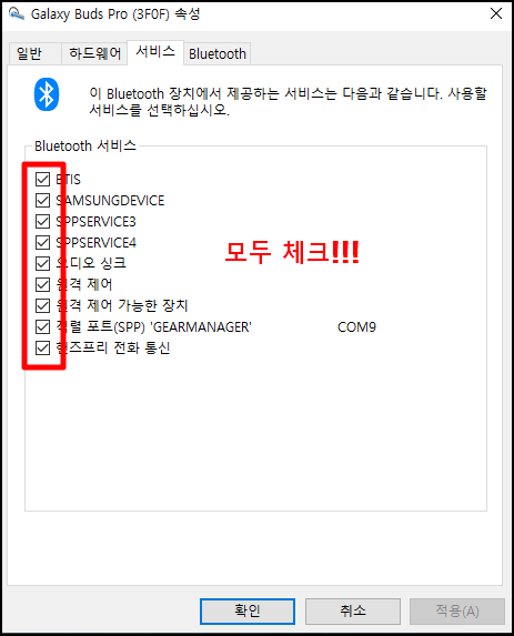 - 버즈 프로가 마이크로 설정이 되어 v 체크가 되어있는 것 확인