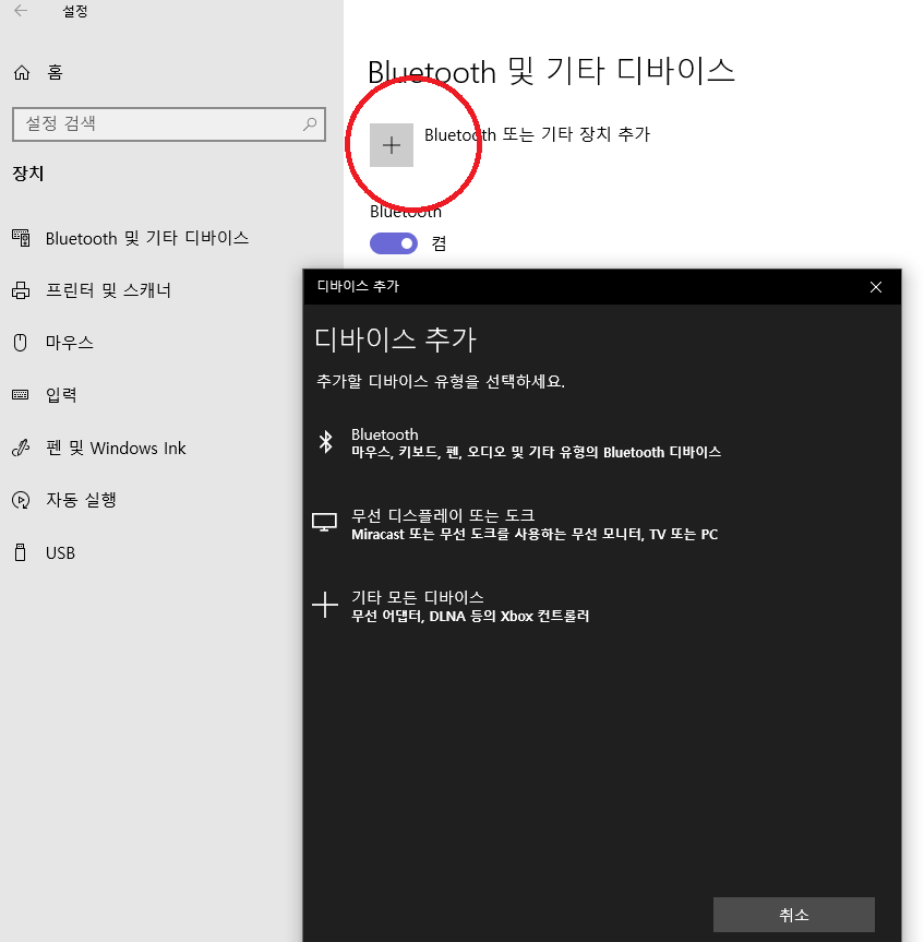 여기에서 블루투스 장치 추가를 클릭하여 줍니다.
