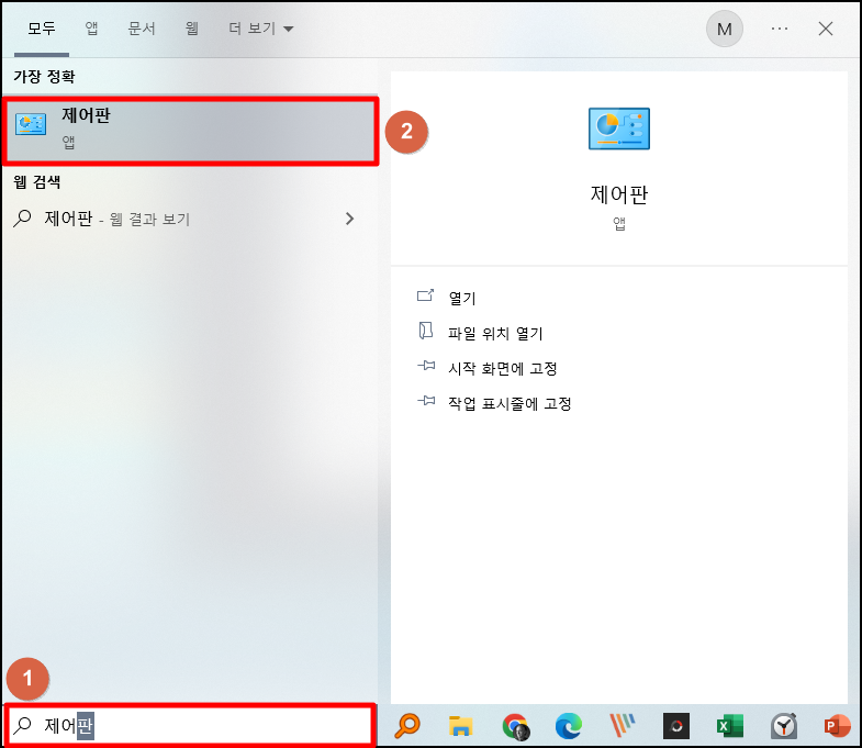 1) 검색에서 '제어판' 입력 및 클릭