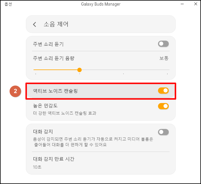 - 아래처럼 '액티브 노이즈 캔슬링'을 ON하면 되고, 반대로 주변 소리를 듣고 싶으면 '주변 소리 듣기'를 ON하면 된다.