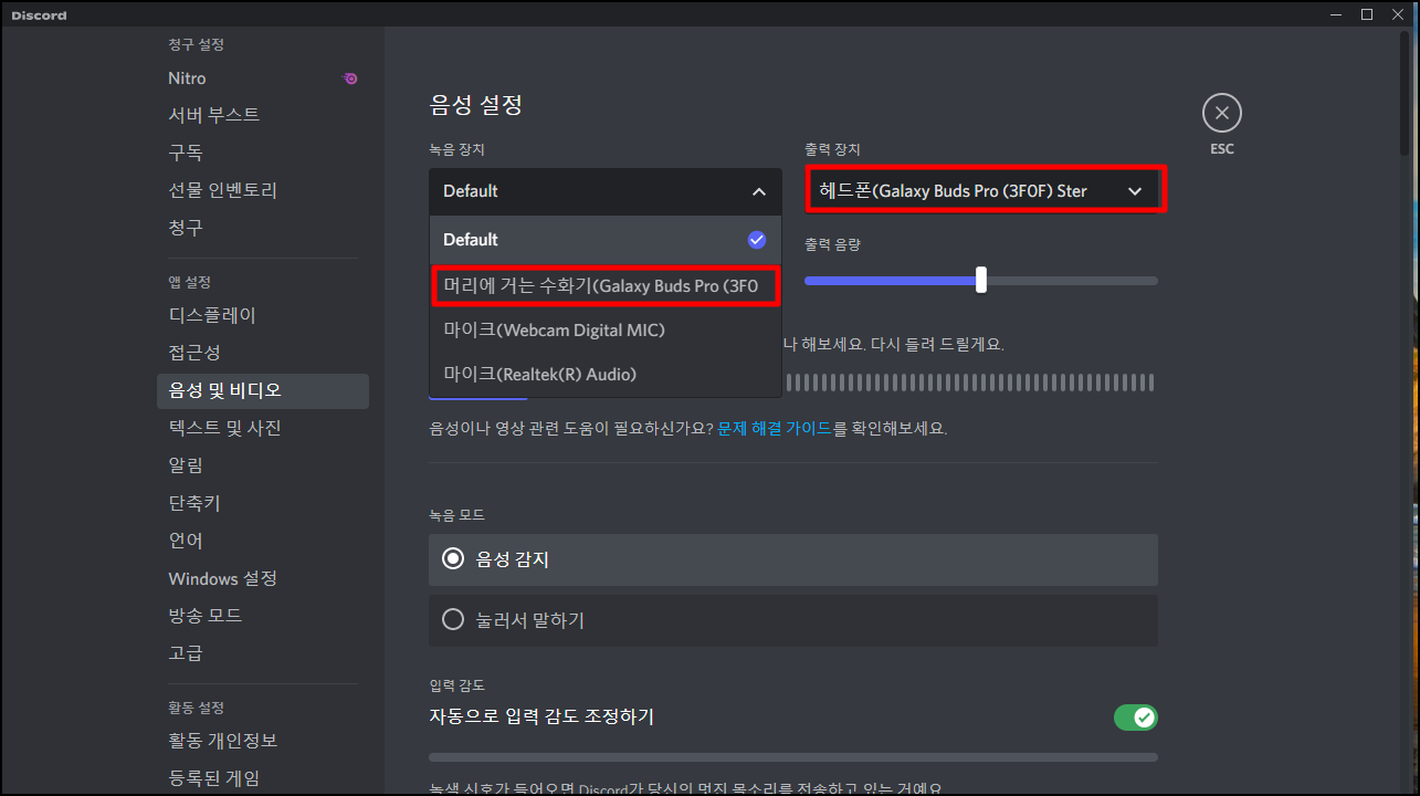 - 디스코드 음성 및 비디오에서 녹음 장치. 출력장치를 갤럭시 버즈 프로로 바꿔준다.