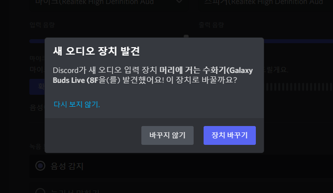 - 설정을 완료하고 디스코드를 실행하게 되면 새 오디오 장치를 발견하였다는 팝업이 뜬다. 장치 바꾸기를 클릭한다.