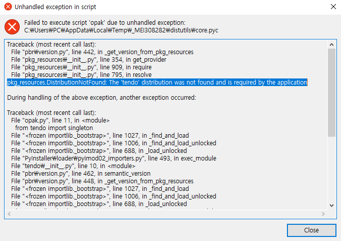 Failed to execute script 'opak' due to unhandled exception: C:\\Users\\PC\\AppData\\Local\\Temp\\_MEI75282\\distutils\\core.pyc