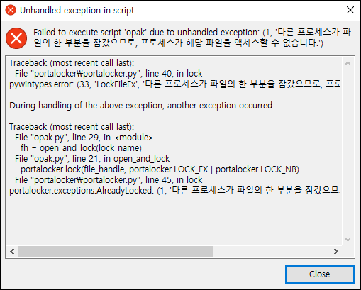 Failed to execute script 'opak' due to unhandled exception: (1, '다른 프로세스가 파일의 한 부분을 잠갔으므로, 프로세스가 해당 파일을 액세스 할 수 없습니다.')