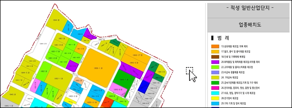 - 산업단지(공단)가 정의되어있으면 조심해야 한다. 산업단지의 경우, 특정 번지마다 특정 업종만 들어올 수 있도록 제한하고 있다. 오수관, 통신배선 등 기반 시설들이 그 특정 산업에 특화되어 설치되어있다.