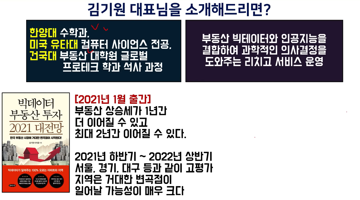 김기원 대표는 데이터에 입각한 부동산 전망을 하는 부동산 전문가로 프롭테크 회사인 리치고의 대표이사이다.