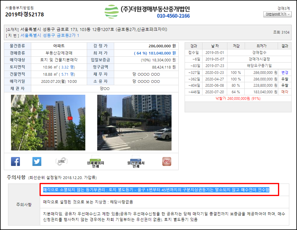 정리하면 집합건물이 지어지기 전 토지에 걸린 권리관계는 토지별도등기에 나온다. 토지별도등기에 나오는 물권 중 근저당권이나 가압류는 경매로 해결되는 경우가 많지만, 가처분이나 가등기, 지상권 등 특별매각조건에 해당하는 권리는 매수자가 인수할 가능성이 높다. 하지만 지상권 중에서도 본건과 같이 구분지상권이 걸려있다면 걱정하지 마시라. 지하철 사용 등 공적인 목적을 위해 정부가 걸어놓은 권리이기 때문이다.