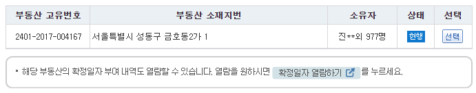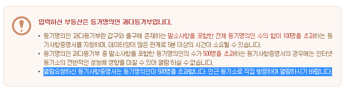 - 977명의 소유자가 있는 토지부 등기부등본인데, 리소스 부족으로 500명이 초과하는 등기부는 등기소로 직접 와서 열람하라고 한다.