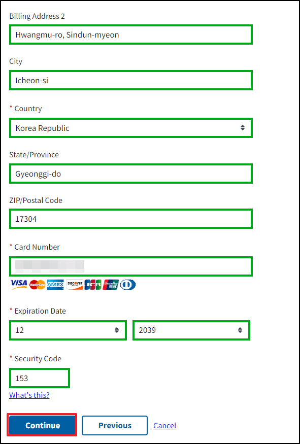 - Cardholer Billing Address (카드 청구주소) :: 카드값청구서 나가는 주소.. 보통 자기 집주소겠지?