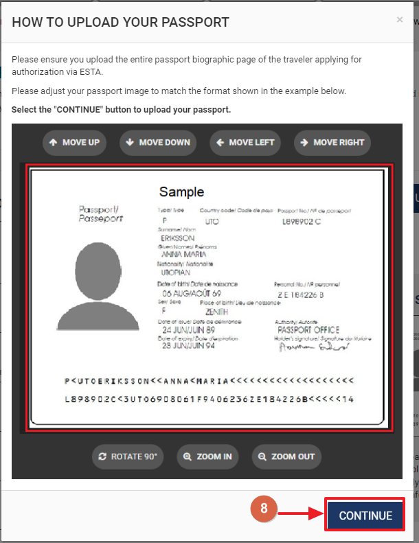8. CONTINUE 클릭 - 여권 스캔 파일 선택
