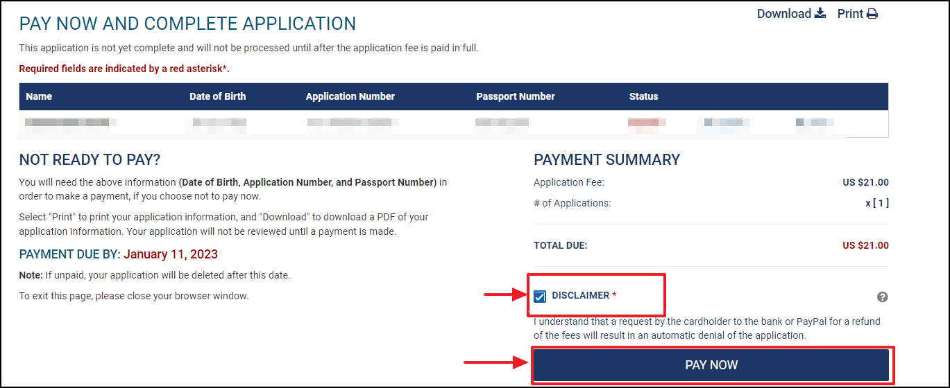 ① DISCLAIMER 클릭 - PAY NOW 클릭