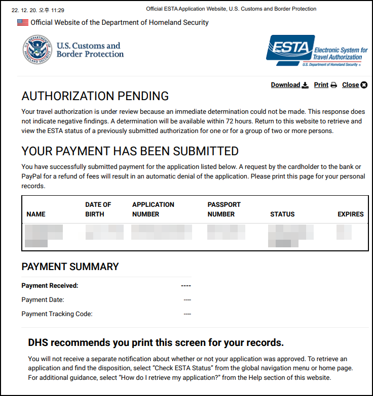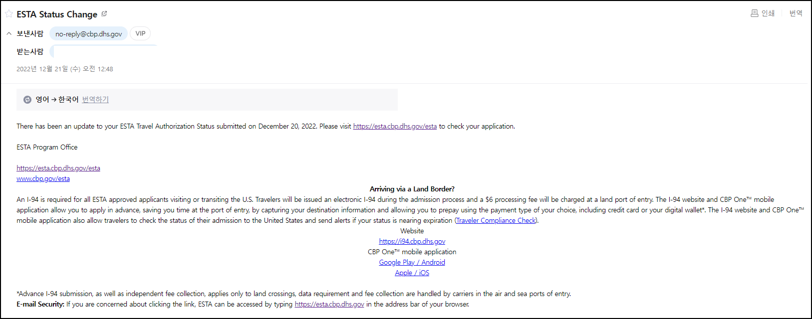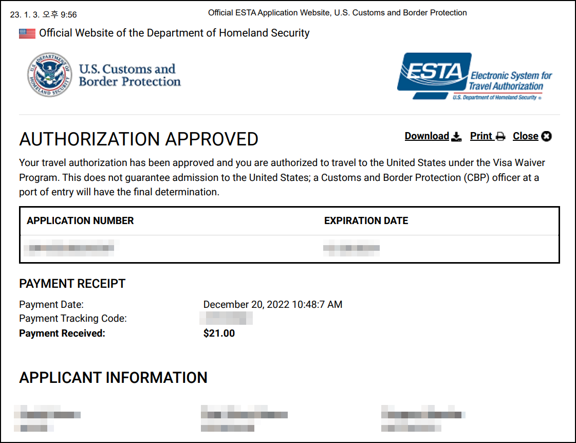 3) 하룻밤 지나고나니 진행상황 변경 메일이 왔다. ESTA 웹사이트에서 신청번호(Application Number)를 입력하니, 권한승인(Authorization Approved)이 나있었다. 권한승인서를 출력해서 이미그레이션 시 보여주면 된다.