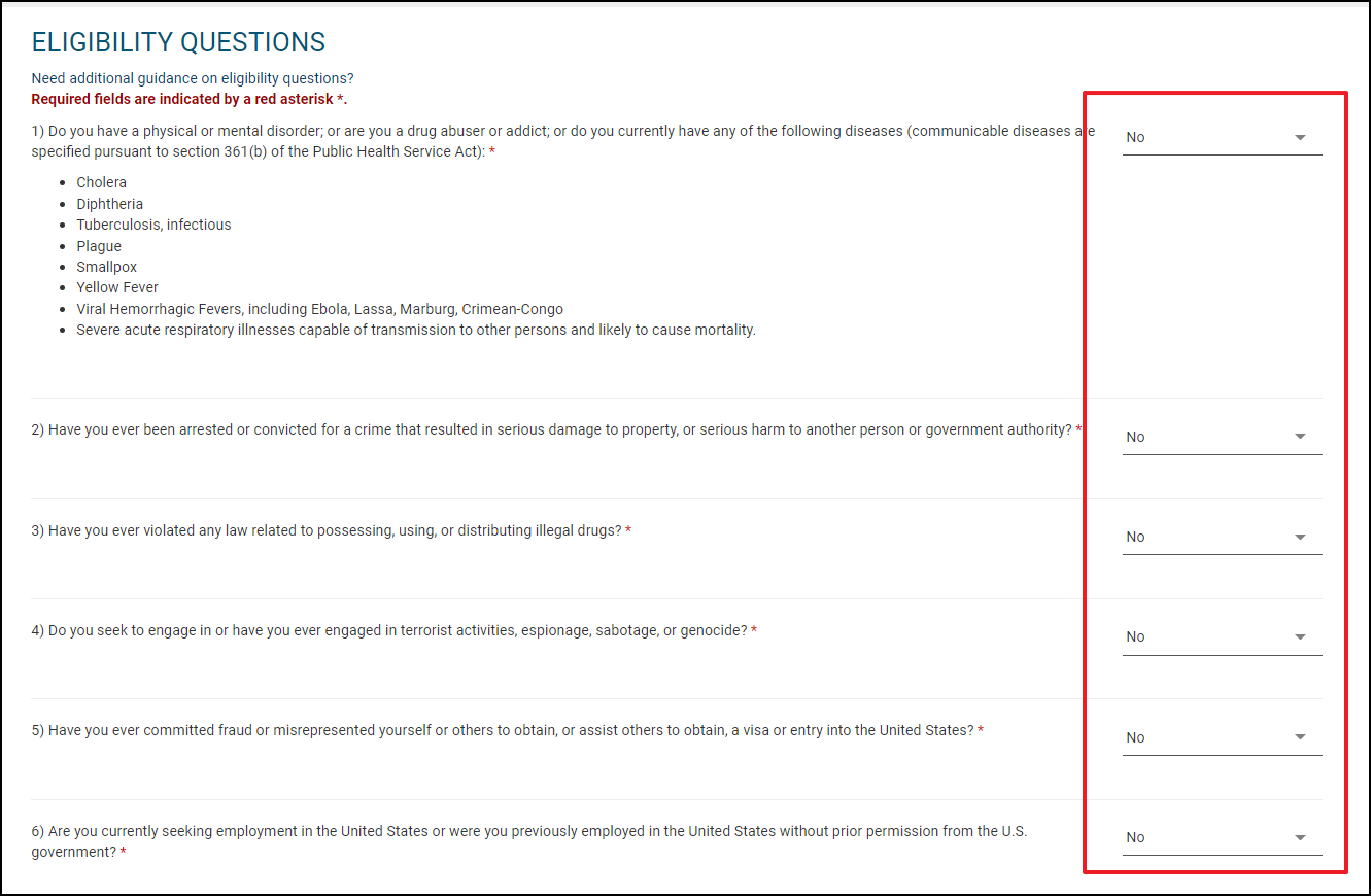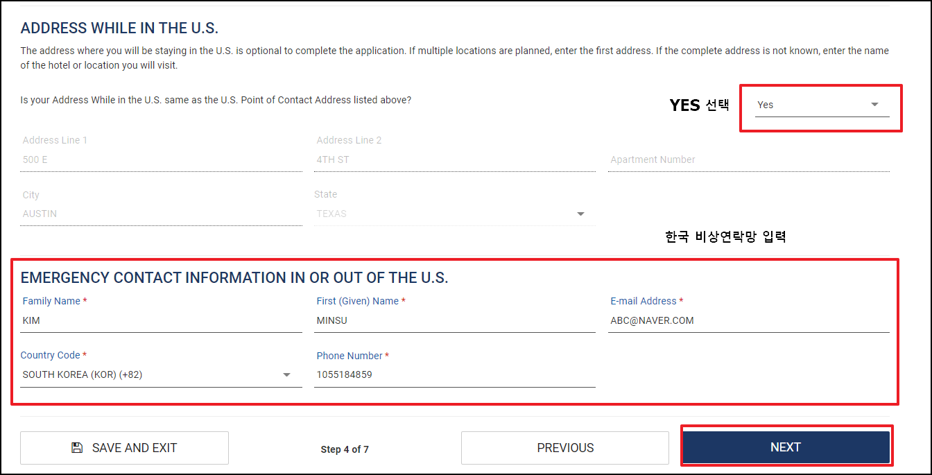 2. Is your Address While in the US same as the US Point of Contact Address listed above? (체류할 주소가 위의 연락처와 동일한가요?) : 필자는 체류지와 비상연락망이 동일하므로 YES 선택