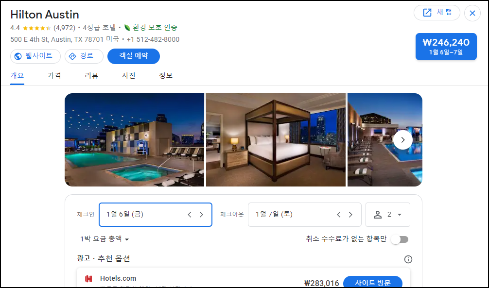 필자는 Austin에 있는 Hilton 호텔에서 숙박할 계획이므로 호텔의 정보를 입력하였다.