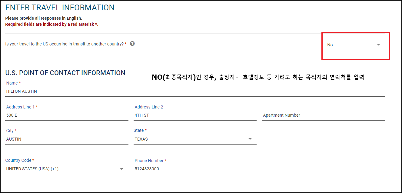 1. Is your travel to the US occuring in transit to another country? (미국이 단순 경유지인가요?)