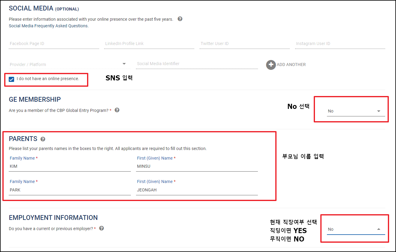 ⑦ Parents(부모님 이름) 입력 :: Familyname(성) Firstname(이름) 순으로 입력