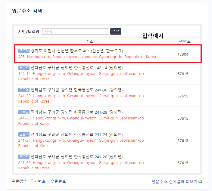 예) 아래 링크에서 영문주소를 참고하여 입력한다.