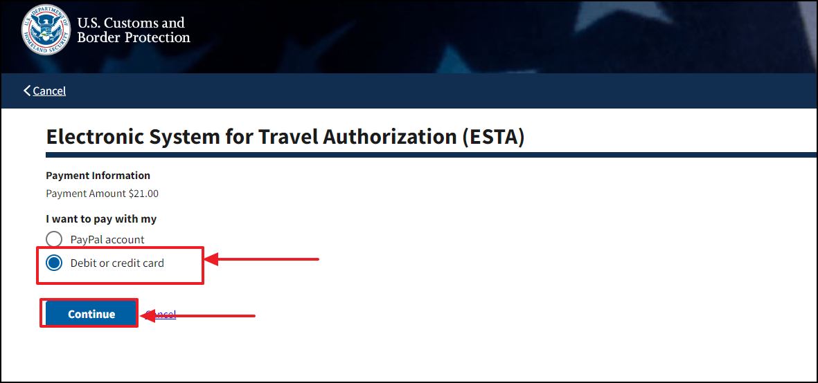 ② Debit or Credit Card (체크카드 또는 신용카드) 클릭 - Continue 클릭