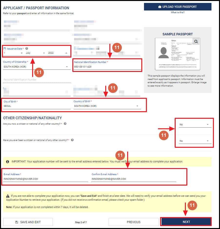 ② Have you ever been a passport or national identity card for travel by any other country? (타국가 여권소지여부) : No 선택