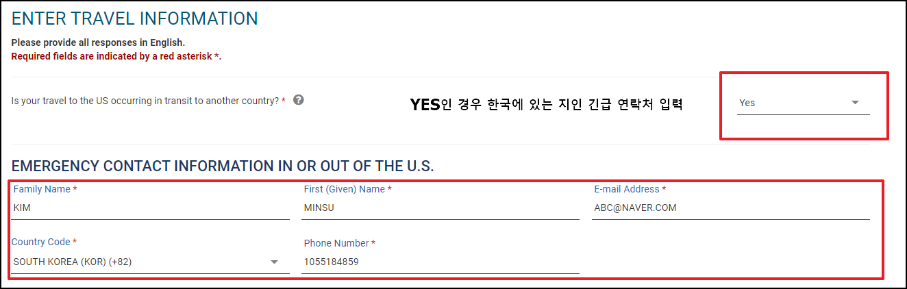 Case1) YES(단순경유지)의 경우, 한국에 있는 지인의 긴급연락처를 입력하면 된다.