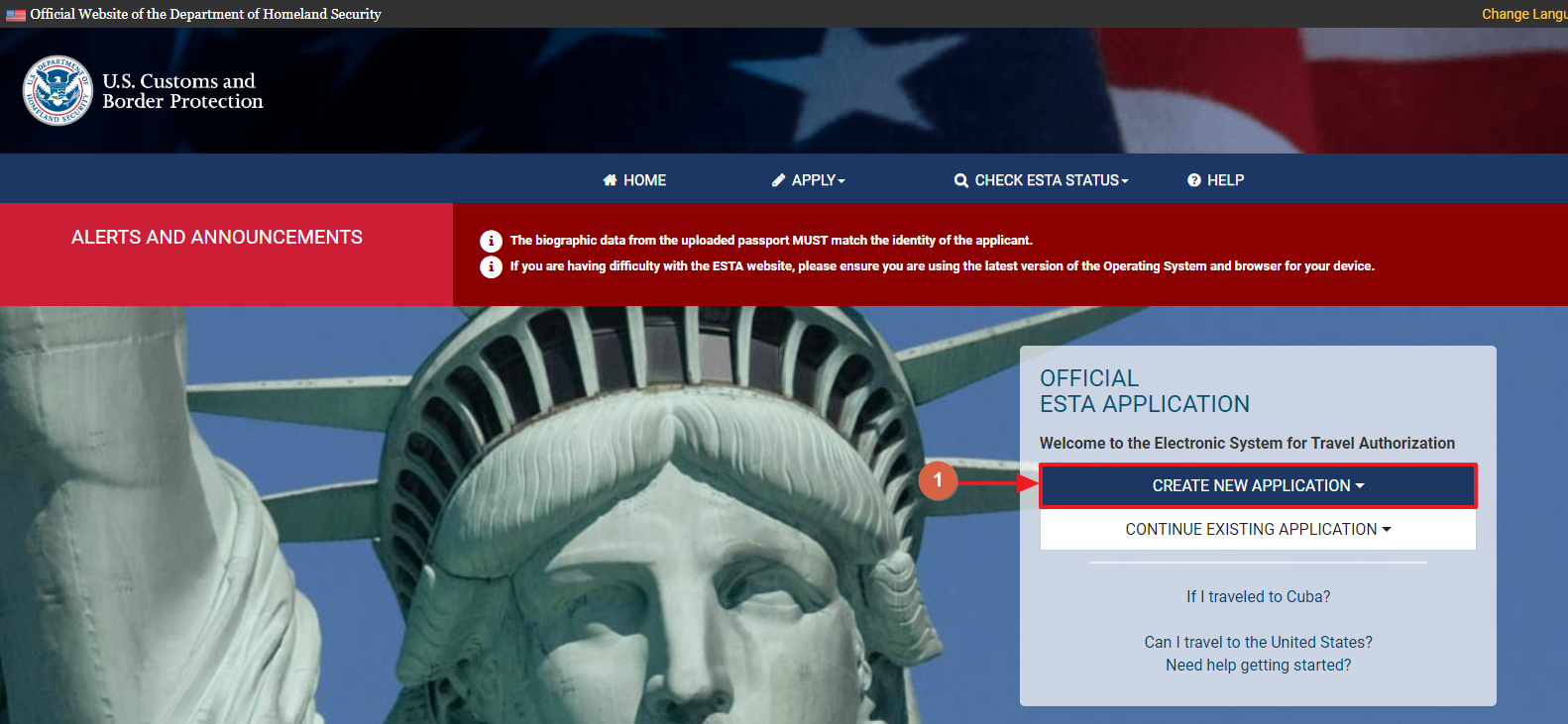 - 미국 비자(ESTA) 신청을 위해 Create New Application 버튼을 클릭한다.