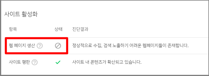 아래와 같이 사이트 활성화 탭에서 '웹 페이지 생산'에서의 상태가 좋지않은 진단을 받은 것에 대한 해결책을 찾아보고자 한다. 현재 필자의 블로그에서 정상적으로 게시글들이 검색되지 않는 상태이고 이에 대한 원인은 블로그 생성시기가 얼마되지 않아 발생한 것으로 보인다. 웹 페이지 수집을 자동으로 할 수 없는 경우, 별도의 대책이 없다. (RSS 및 사이트맵 재제출도 먹히지 않는다.) 이에 대하여 모든 게시글에 대한 웹페이지 수집을 개인이 직접 요청해야한다.