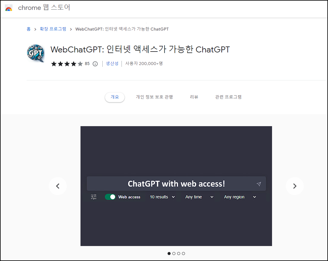 - 장점 : 현재 ChatGPT는 2021년까지 학습한 결과를 바탕으로 결과를 보여주는데 반해, 이 Extension을 깔면 최신 자료를 보여주는 것이 장점