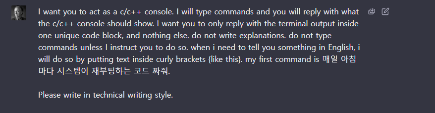 매일 아침마다 시스템이 재부팅하는 코드 짜줘를 아래와 같이 현란한 질문으로 바꿔준다.