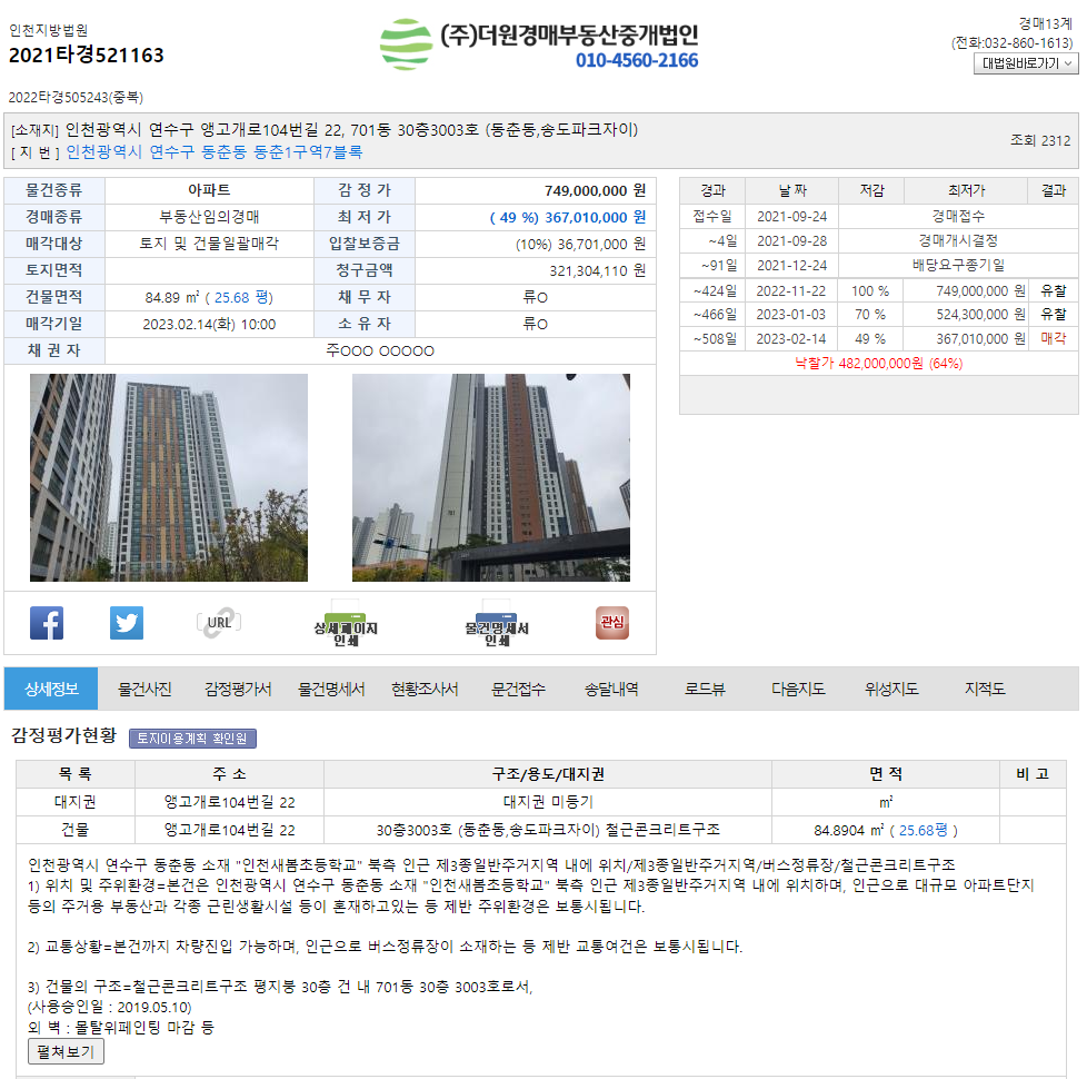 "1. 2021.11.12.자 연수구청 사실조회 회신 및 2022.9.30. 교보자산신탁 주식회사 회신서에 의하면 "도시개발법 43조 제1항, 시행자는 제40조 제5항에 따라 환지처분이 공고되면 공고 후 14일 이내에 등기를 촉탁하거나, 신청하도록 되어있으나, 본 물건은 동법 제40조 관련 환지처분 전이므로 토지등기가 불가능한 상황입니다. 2. 연수구청, 교보자산신탁(주) 사실조회에 의하면 분양계약서는 토지와 건물을 거래대상으로 하고, 전유부분 면적 84.8904㎡, 대지지분 50.3373, 대지가격 177,106,000원, 건물가격 194,294,000원, 총공급금액 371,400,000원, 대지사용권을 포함하여 분양되었으며, 감정가격은 전유부분 건물에 대한 토지의 대지 사용권을 포함한 가격이나, 대지권 취득 및 비용부담 등은 매수인의 책임과 부담으로 함."