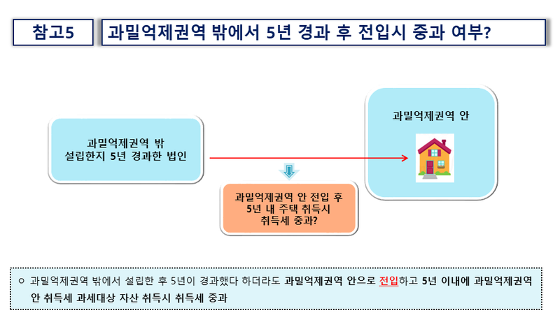 다만, 과밀억제권역 안에 법인을 설립한 후 5년이 경과할 동안 실질적으로 법인 운영을 하지 않고 있다가 5년이 경과한 후 과밀억제권역 안 부동산을 취득할 경우에는 취득세가 중과된다.
