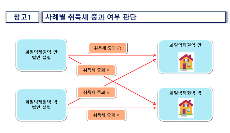 취득세 중과는 과밀억제권역에 본점이 있는 법인이 과밀억제권역 내 물건을 취득할 경우 중과가 적용되므로 과밀억제권역 밖의 물건을 취득하면 취득세가 중과되지 않습니다.