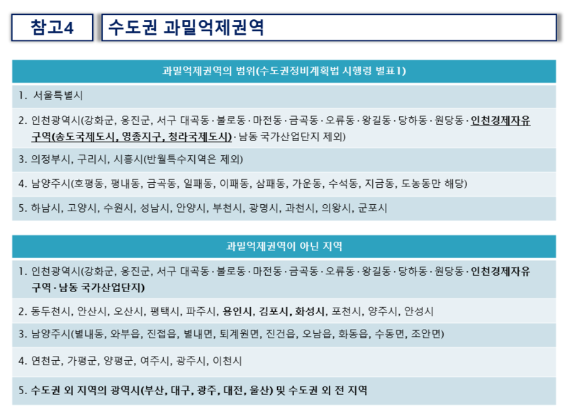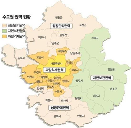 그래서 정부는 수도권에 대한 인구와 경제력 집중을 억제하기 위해 수도권을 과밀억제권역, 성장관리권역, 자연보전권역으로 나눈 다음 이 중 과밀억제권역은 각종 규제를 가하여 해당 지역으로의 인구 및 경제력 유입을 억제하고 있다.