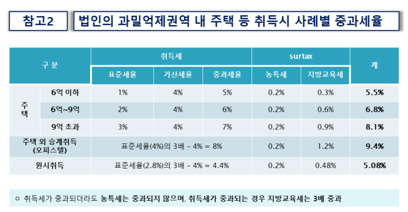 주택에 대해 취득세가 중과되는 경우 4%의 세율이 가산되며, 지방교육세가 3배 중과되는데 이 경우 세부담이 급격히 증가한다.