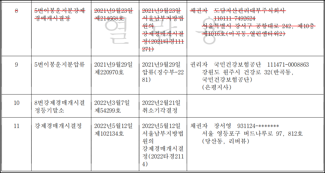 하지만, 9번과 11번에 의한 강제경매가 후순위로 걸려있음에 따라, 8번 권리는 말소되고 강제경매개시 자체는 속행된 것으로 풀이됩니다.