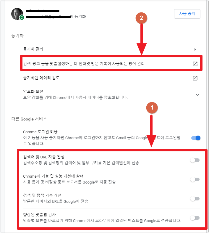 구글 크롬에는 사용자의 기록을 데이터화하여 저장해 어떻게든 쓰고싶어한다. 이런 바퀴벌레 알같은 놈들을 전부 끄자.
