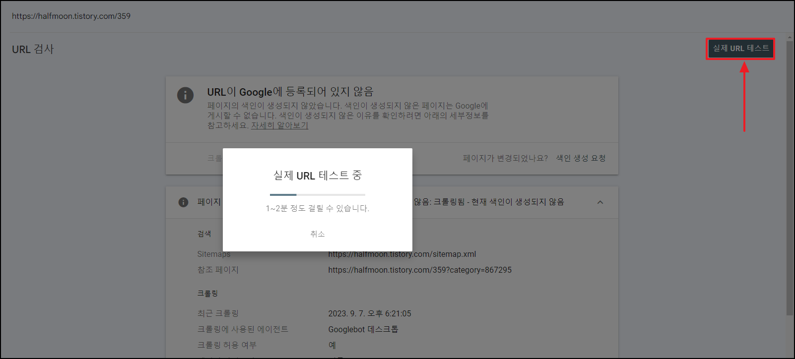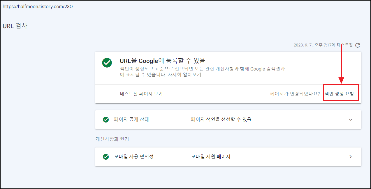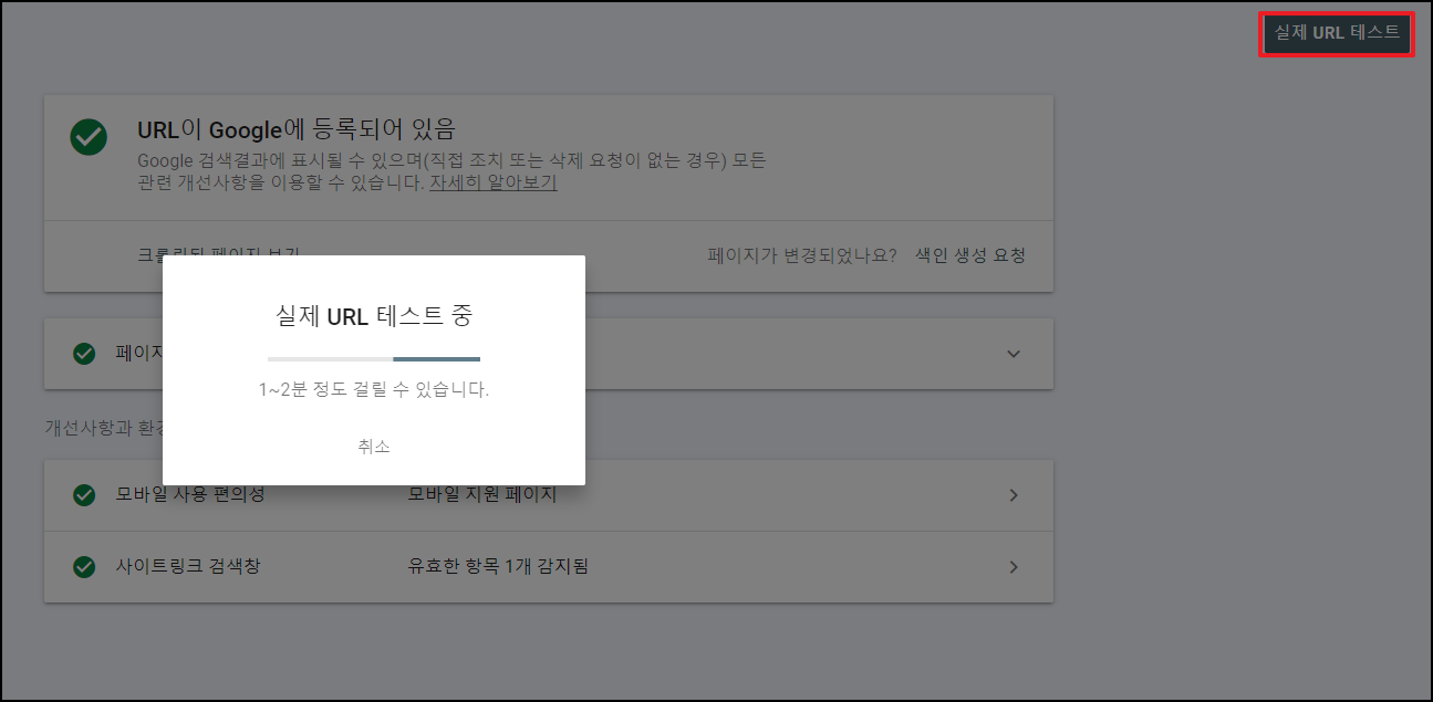 참고로, 우측 상단에 '실제 URL 테스트'를 하게 되면, 실시간으로 URL이 표준 URL인지, 색인 생성이 가능한지 여부를 실시간 체크해준다. (체크만 실시간이지, 색인 생성을 실시간으로 해주는 것은 아니다.)