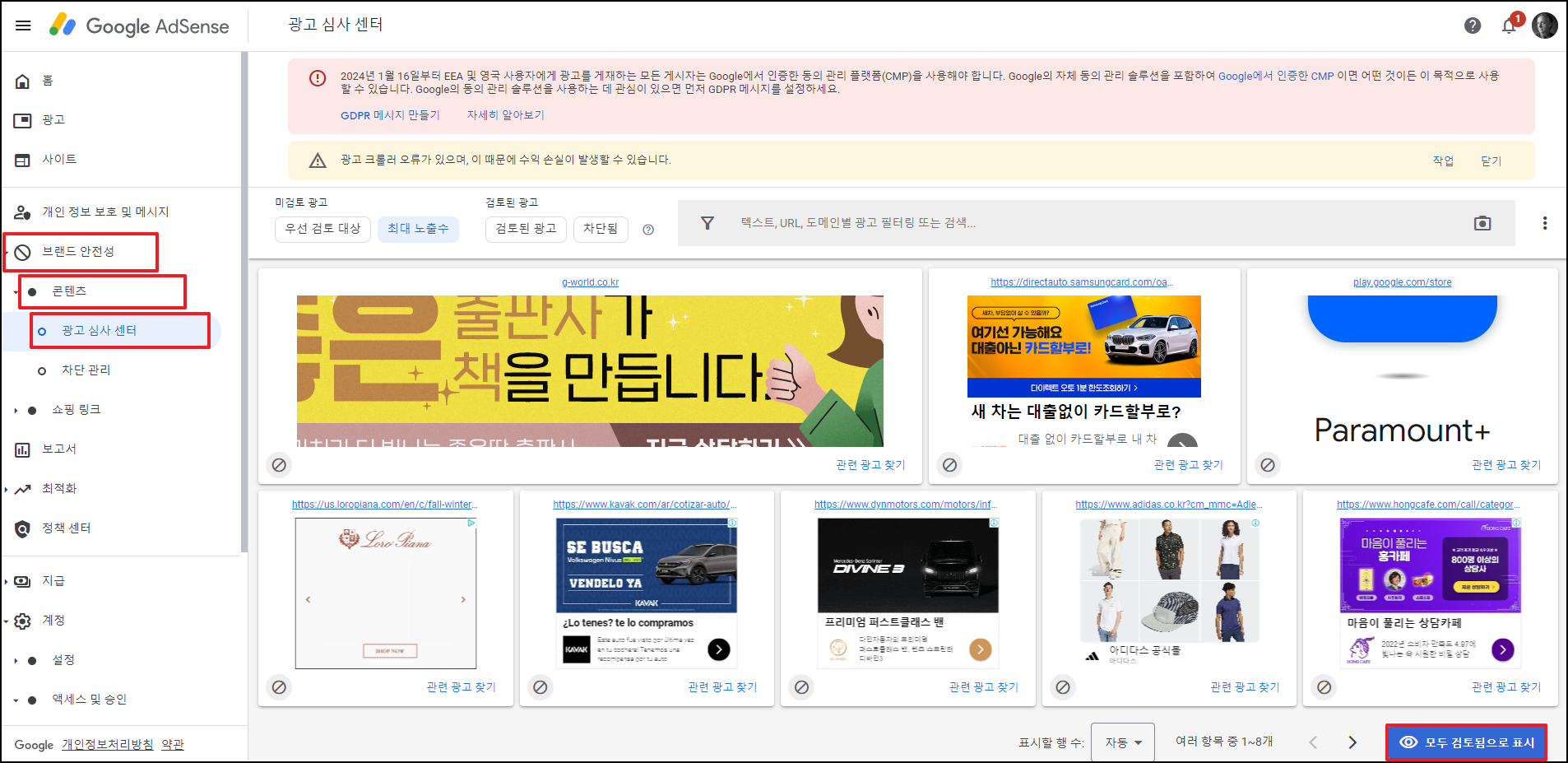 가끔 내 블로그에 실린 광고들을 보면 항상 같은 광고들만 실리는 현상을 볼 수 있었다. 구글 애드센스 사이트에 '브랜드 안정성' - '콘텐츠' - '광고 심사 센터'에는 내 블로그에 어떤 광고가 실리는지 검토할 수 있는 페이지로, 그간 내가 허용을 안해줬기 때문에 광고가 선별적으로 실리고 가끔은 실을 광고가 없어 빈 애드센스 로고만 떠있는 것을 볼 수 있었다.