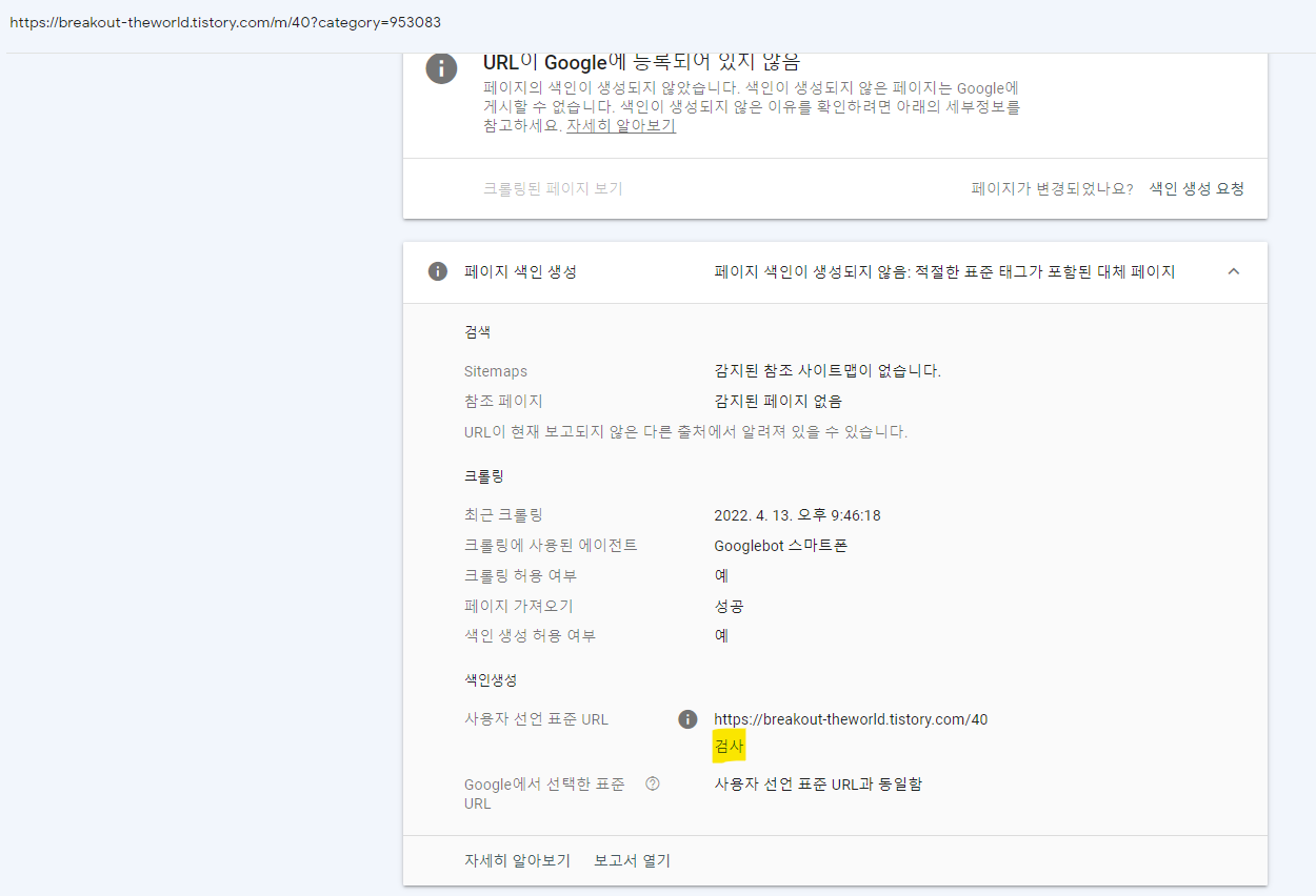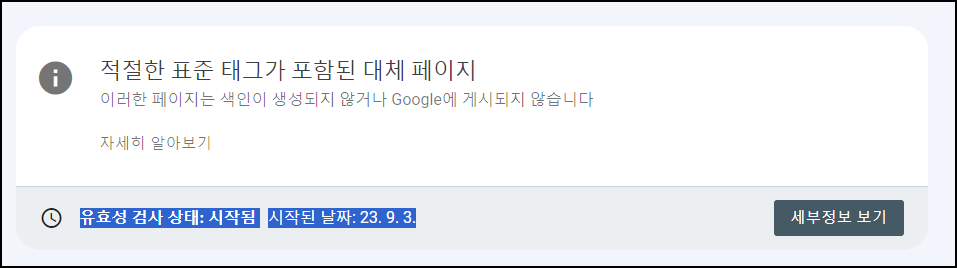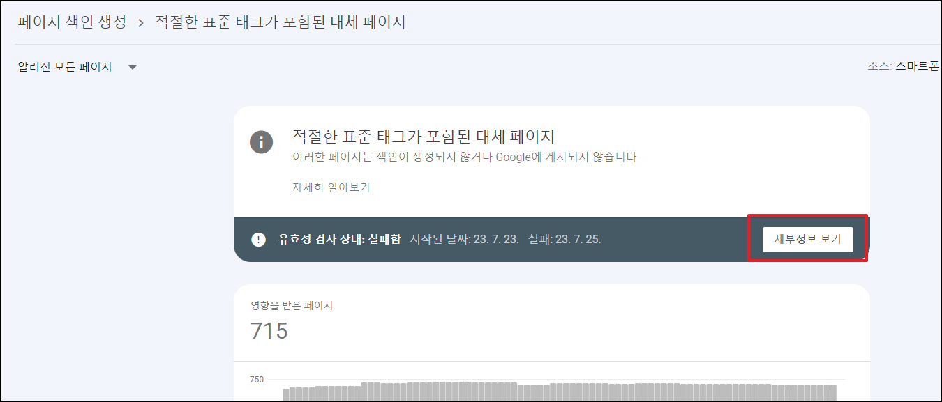 아무 사유나 눌러준다. (필자는 <적절한 표준 태그가 포함된 대체 페이지> 색인 실패를 눌렀다.)