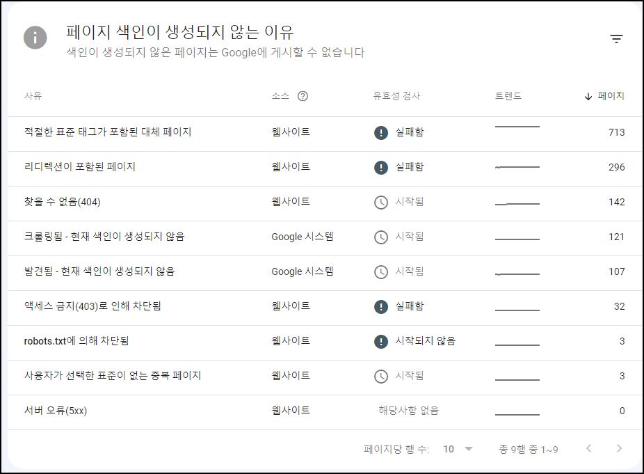 필자는 총 9개의 색인실패 사유가 떴는데, 사유에 대한 세부사항을 살펴보기에 앞서, 가장 최근 유효성 검사가 2주 전이다. 새로운 유효성검사를 수동으로 진행해주고 다시 살펴보는 것이 좋겠다.