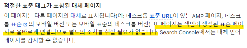 그리고 실패한 사유중 가장 많은부분을 차지하는게 "적절한 표준태그가 포함된 대체 페이지"였다. 페이지 색인 생성 보고서에 따르면 본 문제는 표준 URL외에 다른 URL(모바일버전, AMP페이지등)이 있는 경우로 별도의 조치를 취할 팔요가 없다고 나와있다.