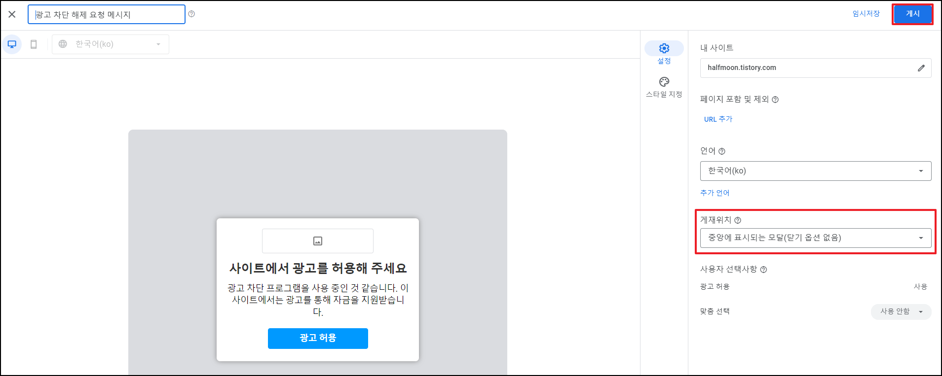 게재위치 - '중앙에 표시되는 모달(닫기 옵션 없음)'을 선택 후 게시 클릭