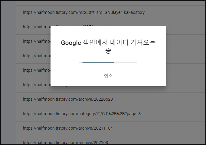 돋보기 모양 클릭하면 아래와 같이 Google 색인에서 데이터 가져오는 중.. 이라는 메시지가 뜨고 조금 기다리면 색인 여부를 확인한다.