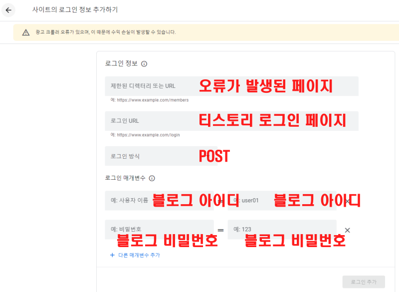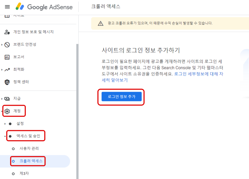 구글 애드센스 좌측 메뉴에서 계정> 액세스 및 승인> 크롤러 액세스> 로그인 정보 추가 선택