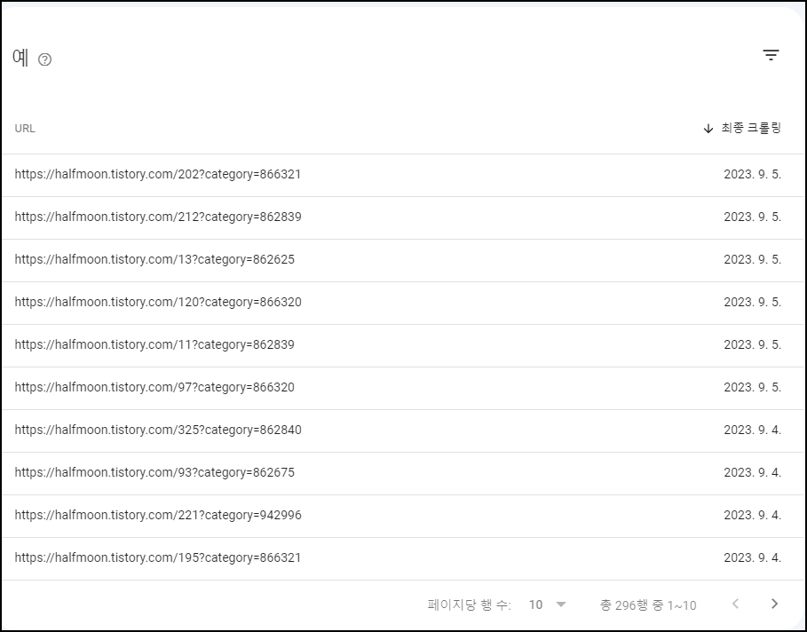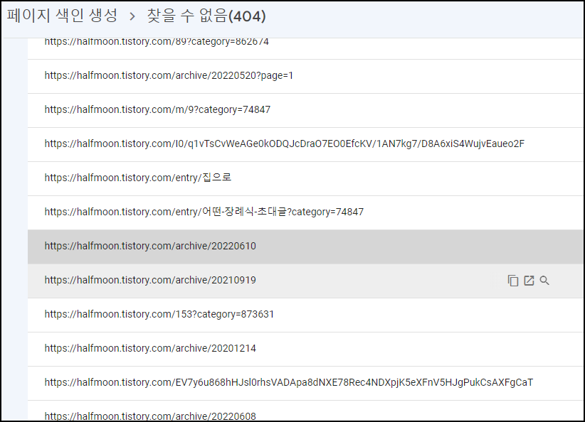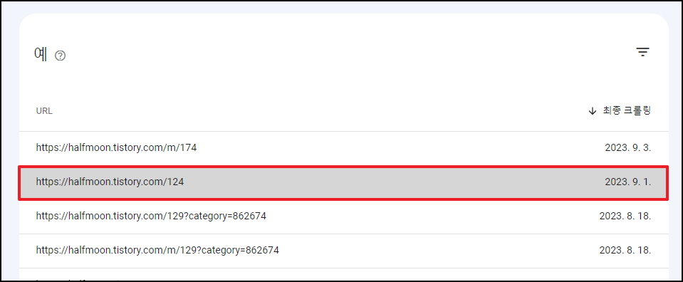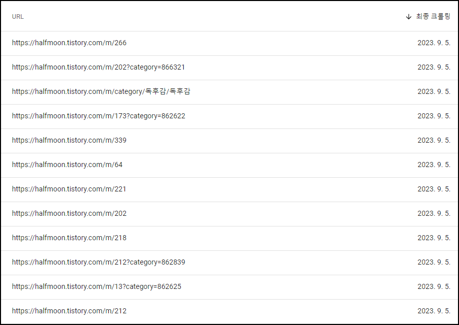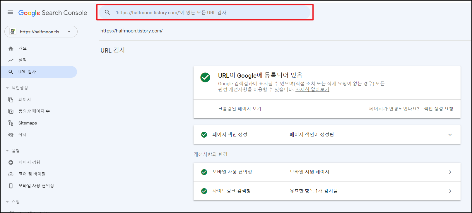 구글 서치콘솔 웹사이트에서 내 블로그 주소로 색인되어있는 모든 URL을 검사해봤다.